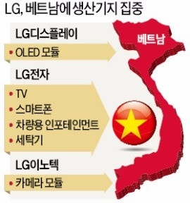 신규 생산라인 투자도 베트남에 집중할 계획이다. LG전자는 베트남 공장의 차량용 인포테인먼트(IVI) 생산량을 올해 약 400만대에서 2018년 1000만대 이상으로 늘릴 방침이다. LG이노텍도 카메라 모듈 공장을 베트남에 지을 예정이다.