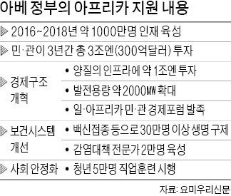 28일 요미우리신문 등에 따르면 아베 총리는 지난 27~28일 케냐 나이로비에서 열린 ‘제6회 아프리카개발회의(TICAD)’ 기조연설에서 이 같은 지원책을 발표했다. TICAD는 1993년부터 5년마다 일본에서 열렸지만 이번에 처음으로 아프리카에서 개최됐다.