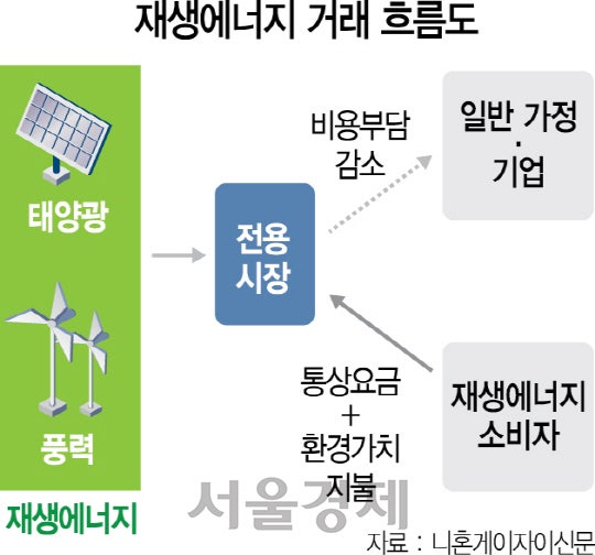 재생에너지 전용 거래시장 개설은 전기를 사용하는 모든 가정과 기업에 일괄적으로 재생에너지 설비 도입 비용을 부담해왔던 기존 방식을 바꾸기 위해 마련됐다. 최근 수년간 재생에너지 보급이 확산하면서 지난 2012년 월 60엔대에 불과했던 가정별 분담금(표준가정 기준)은 올해 월 675엔으로 10배나 치솟았다. 일본 정부는 전용시장을 신설하면 재생에너지를 사용하지 않는 일반 가정의 전기료 부담이 줄어들 것으로 판단하고 있다.