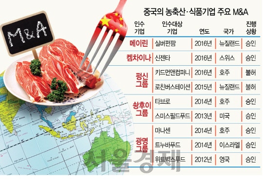 올 들어서는 연초 중국 최대 화학기업 중국화공(켐차이나)이 스위스 종자기업 신젠타를 440억달러에 인수한다고 발표하자 스위스는 물론 신젠타의 주 판매시장인 미국에서도 반대 목소리가 나왔다. 우여곡절 끝에 미국이 지난달 켐차이나의 신젠타 인수를 승인하기는 했지만 중국의 농업·식료품 기업 사냥에 대한 글로벌 시장의 반감 수위는 점점 높아지고 있다. 월스트리트저널(WSJ)은 “미국을 비롯해 호주·뉴질랜드 등 중국 기업의 인수합병 대상이 된 국가들은 자국 식량안보에 위협이 된다고 판단하면 언제든 M&A 조건을 수정하거나 자국 내 자산 매각을 요구할 것”이라고 지적했다.