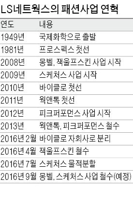 LS네트웍스는 4년 전만 하더라도 6개 패션 브랜드를 갖고 있었다. 1981년 첫선을 보인 토종 스포츠 브랜드 프로스펙스를 비롯해 일본 몽벨, 독일 잭울프스킨, 미국 스케처스, 스위스 피크퍼포먼스, 자체 아웃도어 편집숍 웍앤톡 등으로 사업을 확대해갔다.